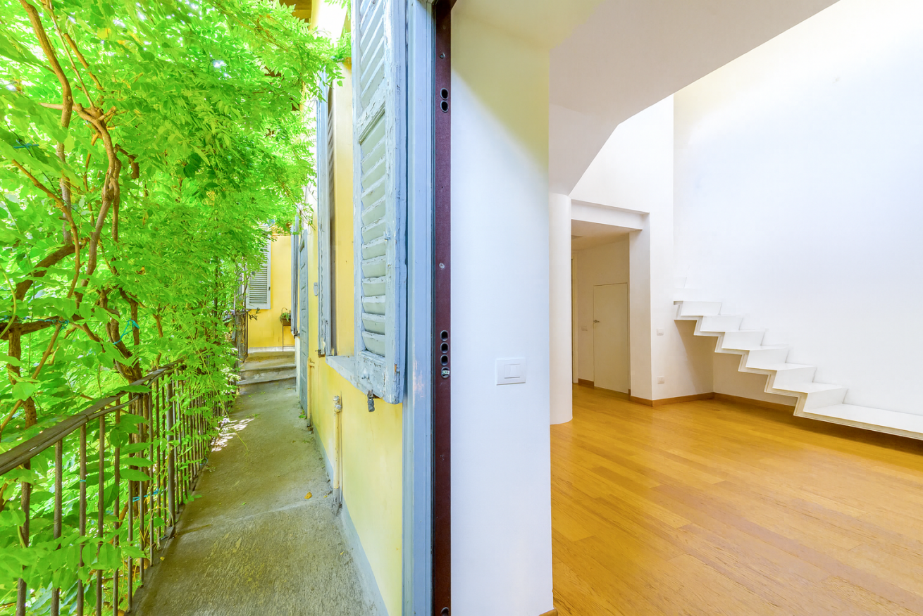 Il terrazzo, che offre una vista suggestiva sui tetti di Milano, aggiunge un ulteriore elemento di esclusività all'appartamento.